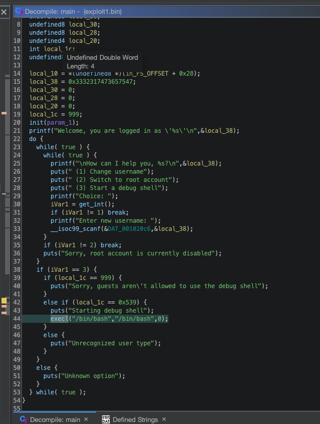 在输入username的地方溢出,将loacl_1c的位置覆盖为0x539即可