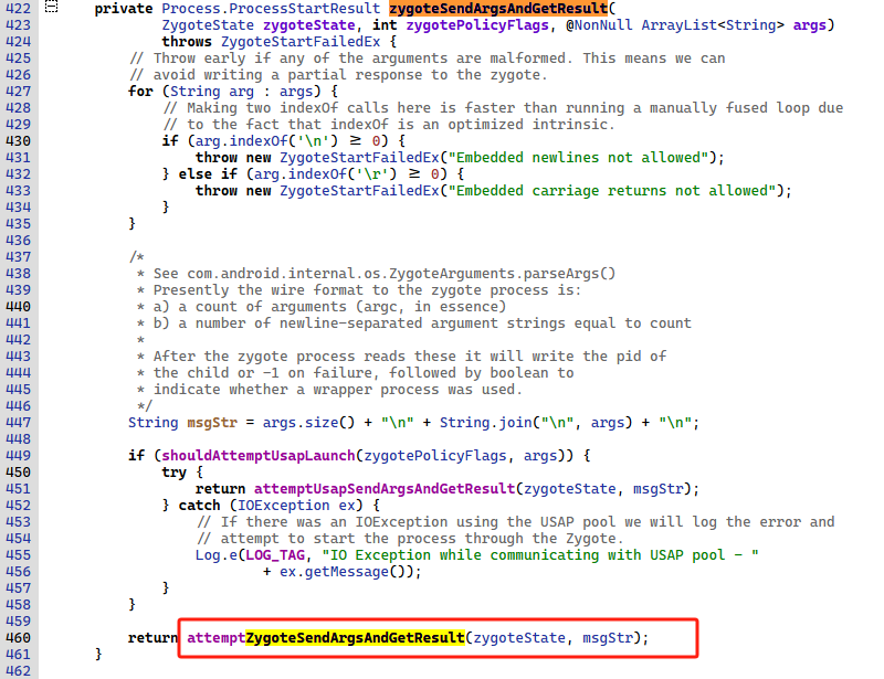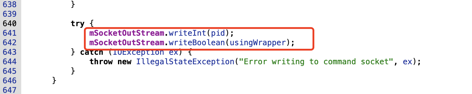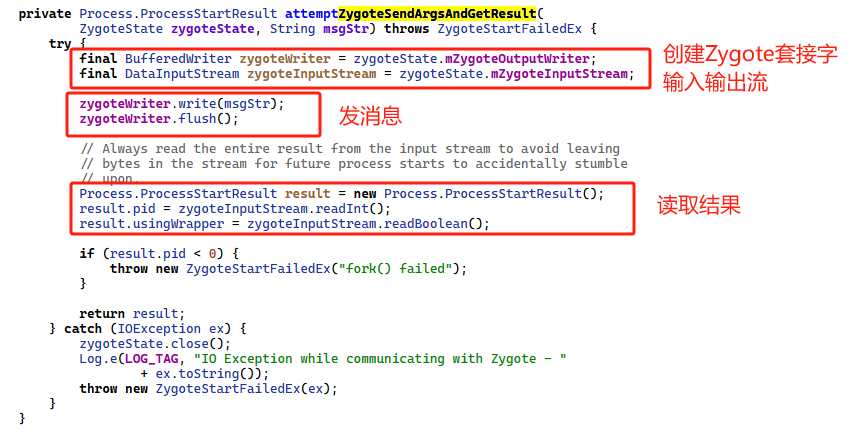 再到attemptZygoteSendArgsAndGetResult,与Zygote的通信就在这里面。