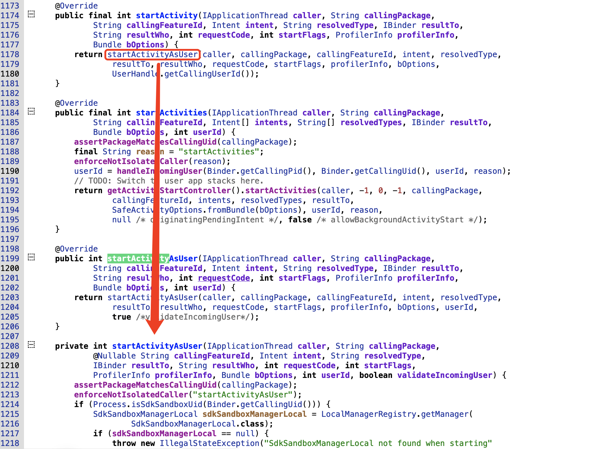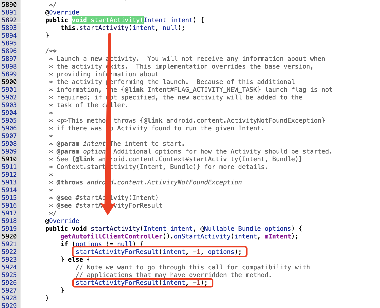 以execStartActivity (不带 UserHandle 参数) 为例,红框处为关键代码。