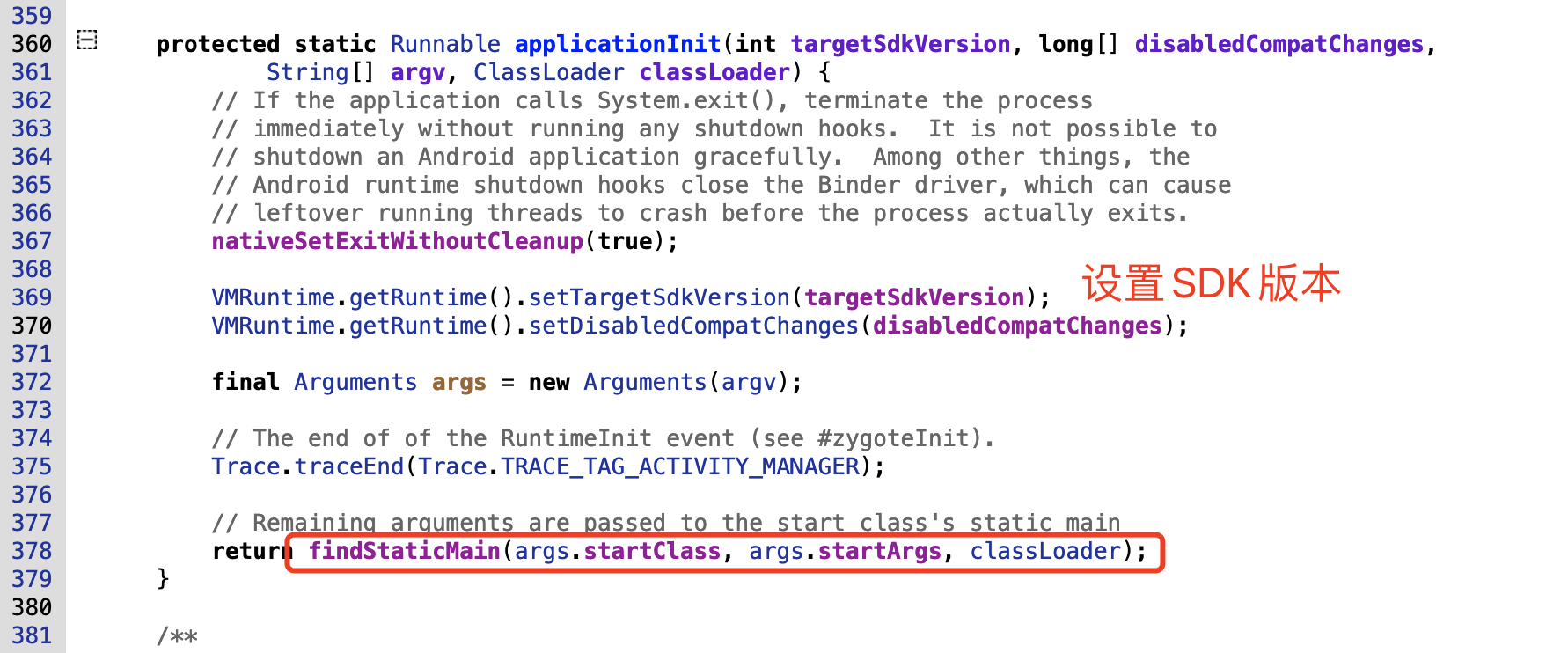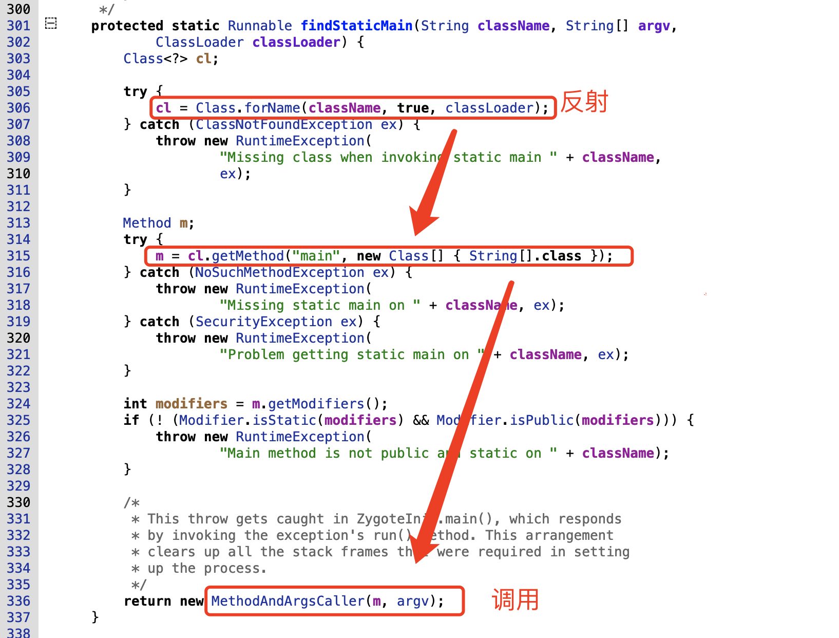 进入到findStaticMain,这个方法中,将通过反射找到之前传入的entryPoint(android.app.ActivityThread),然后调用其main方法。