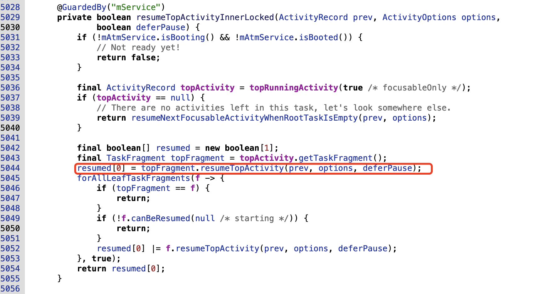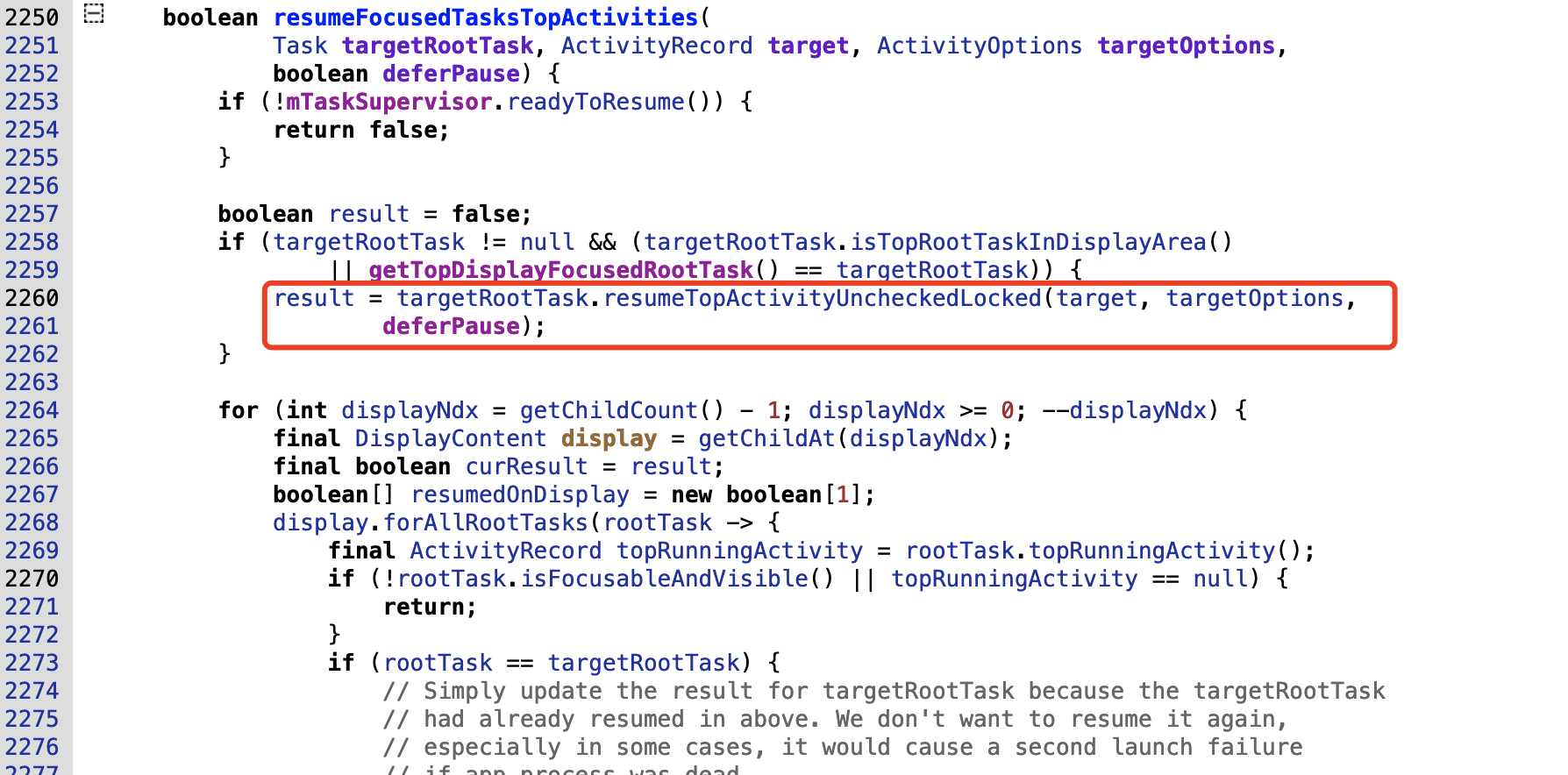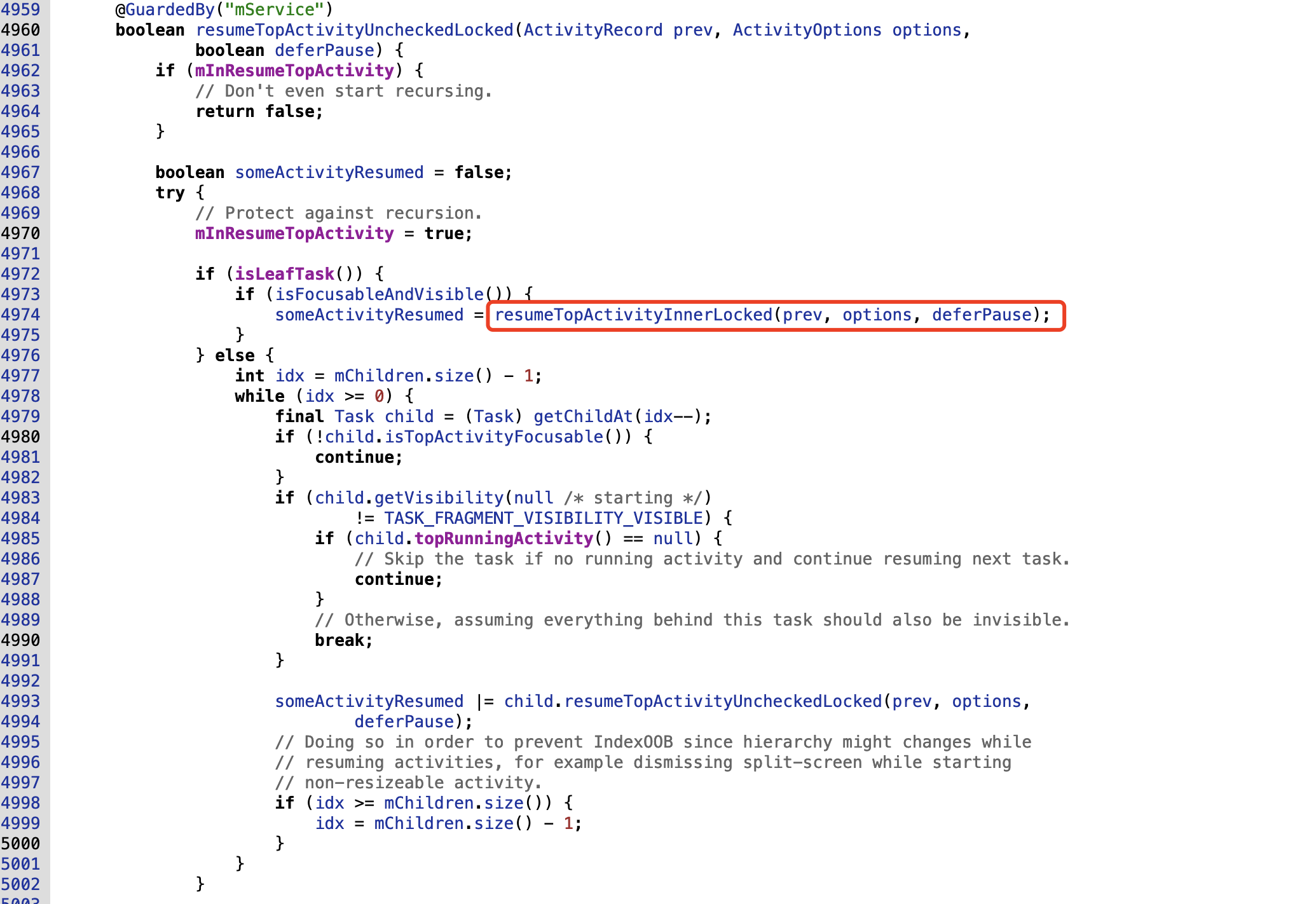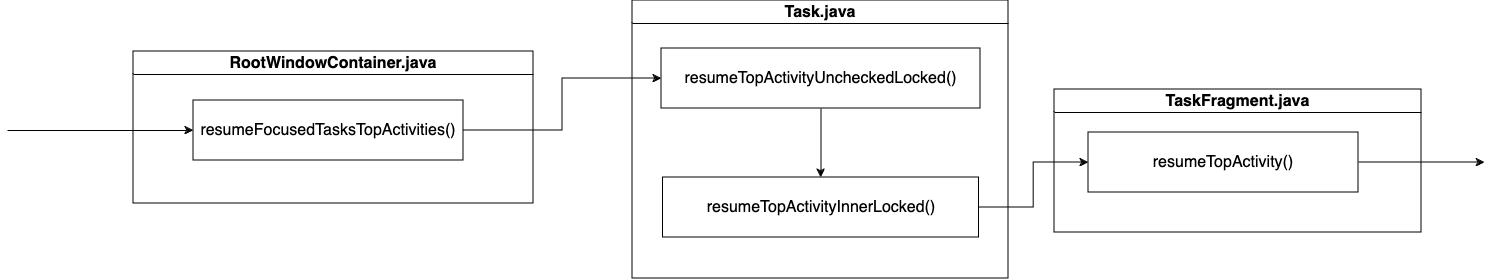 resumeFocusedTasksTopActivities将会调用Task和TaskFragmentPause前台程序,为新的应用程序启动做准备。