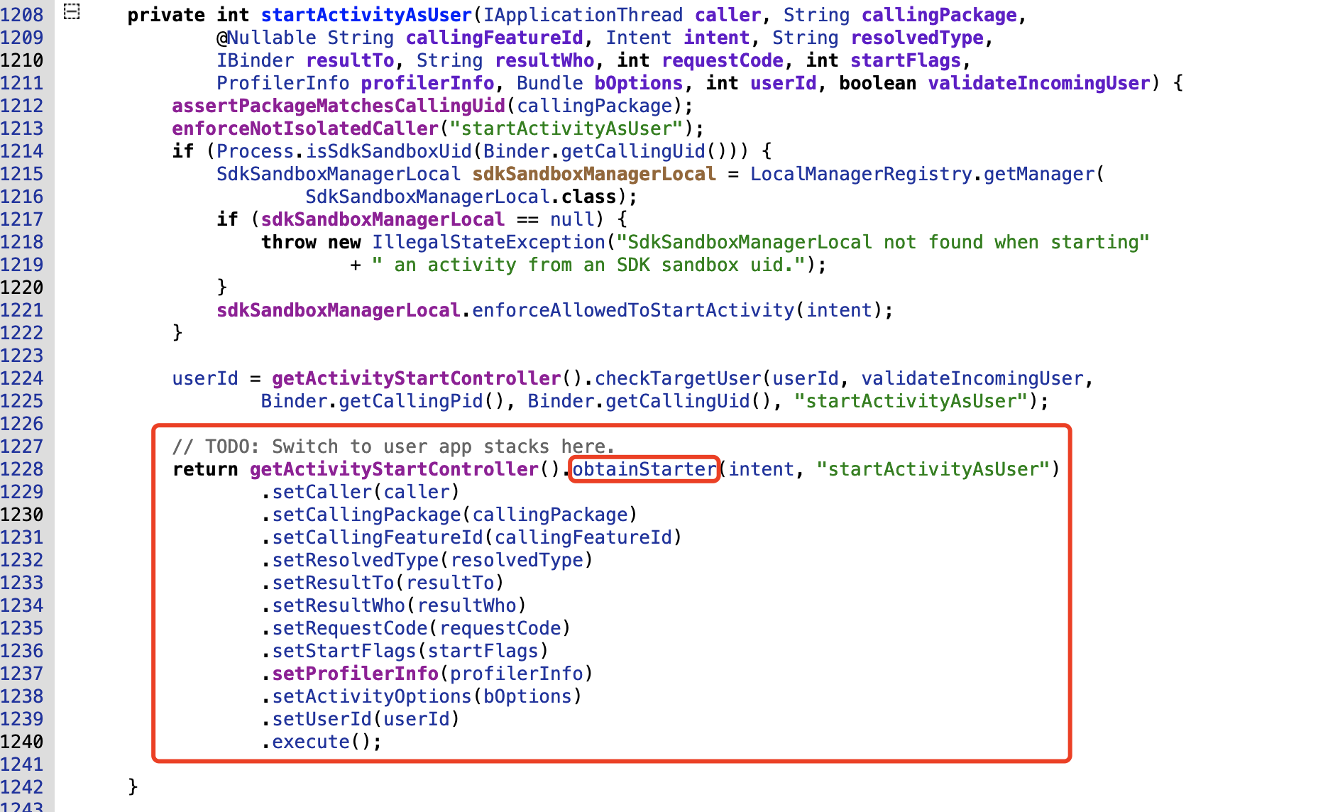 startActivityAsUser方法通过ActivityStartController的obtainStarter方法获取了ActivityStarter对象实例,并调用ActivityStarter的execute方法