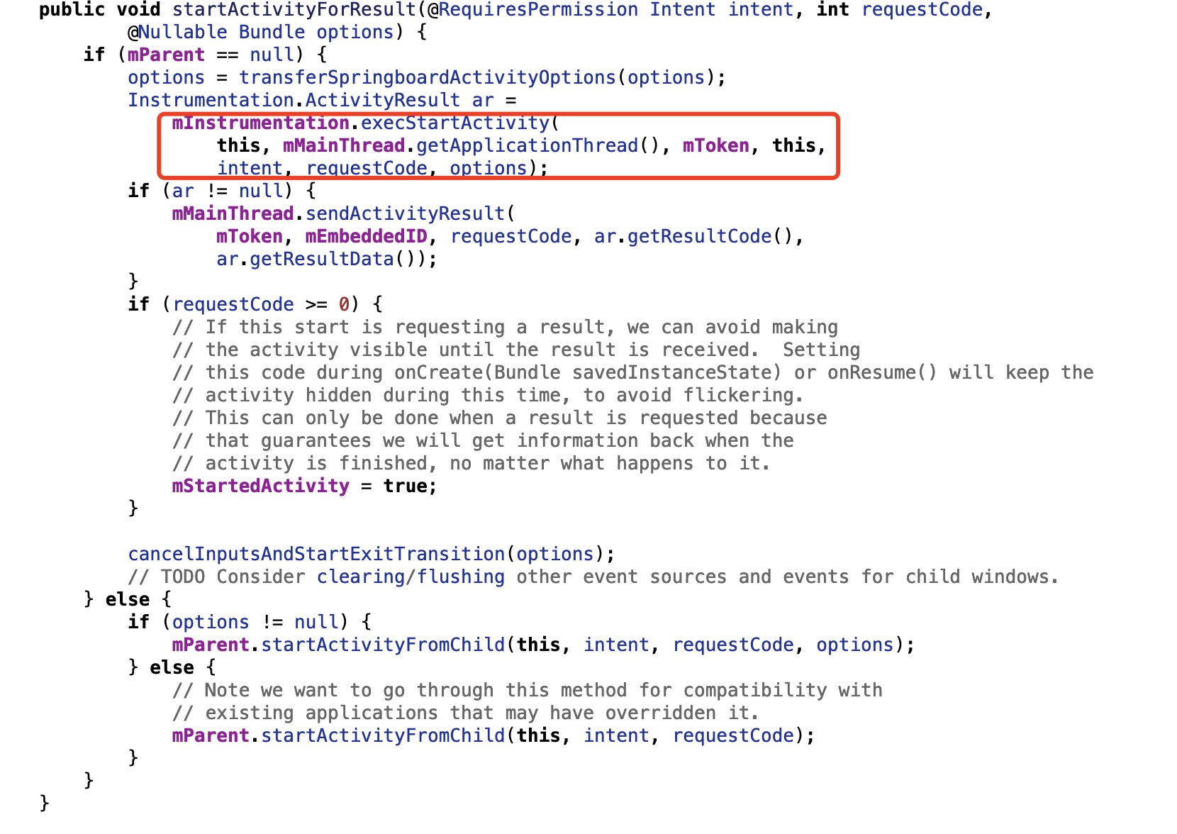 如果当前 Activity 没有父 Activity (mParent == null),则会调用 Instrumentation 类的 execStartActivity 方法来启动新的 Activity。如果 requestCode 大于等于 0,则标记 mStartedActivity 为 true,这样可以避免在 Activity 初始化期间的闪烁现象,直到收到启动的 Activity 的结果为止。
