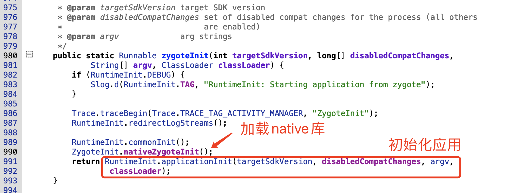 handleChildProc中会调用ZygoteInit.``zygoteInit来初始化应用程序