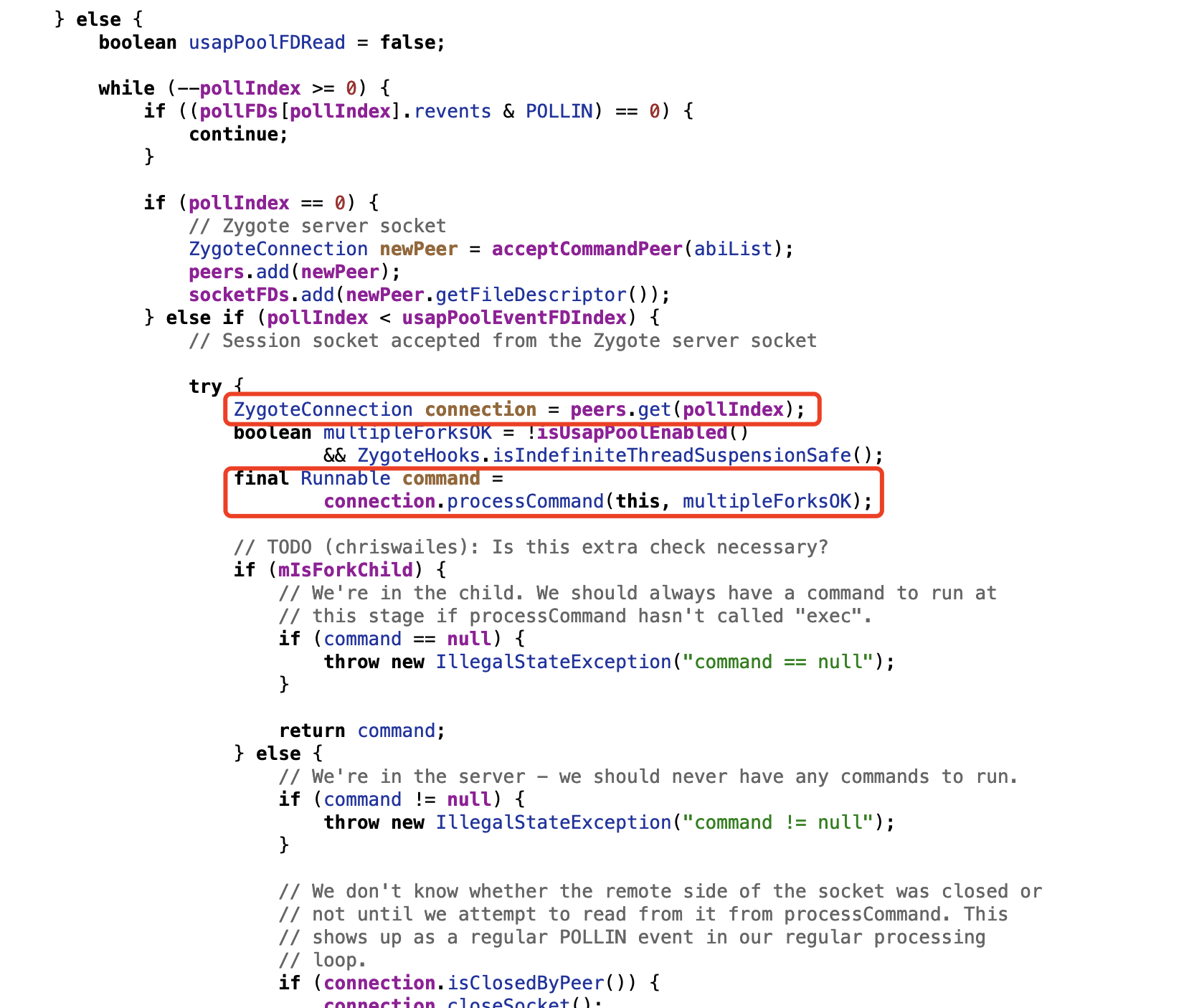 这段代码是 Zygote 进程中的一个关键部分,用于处理来自客户端的命令,以启动新的应用程序进程。
