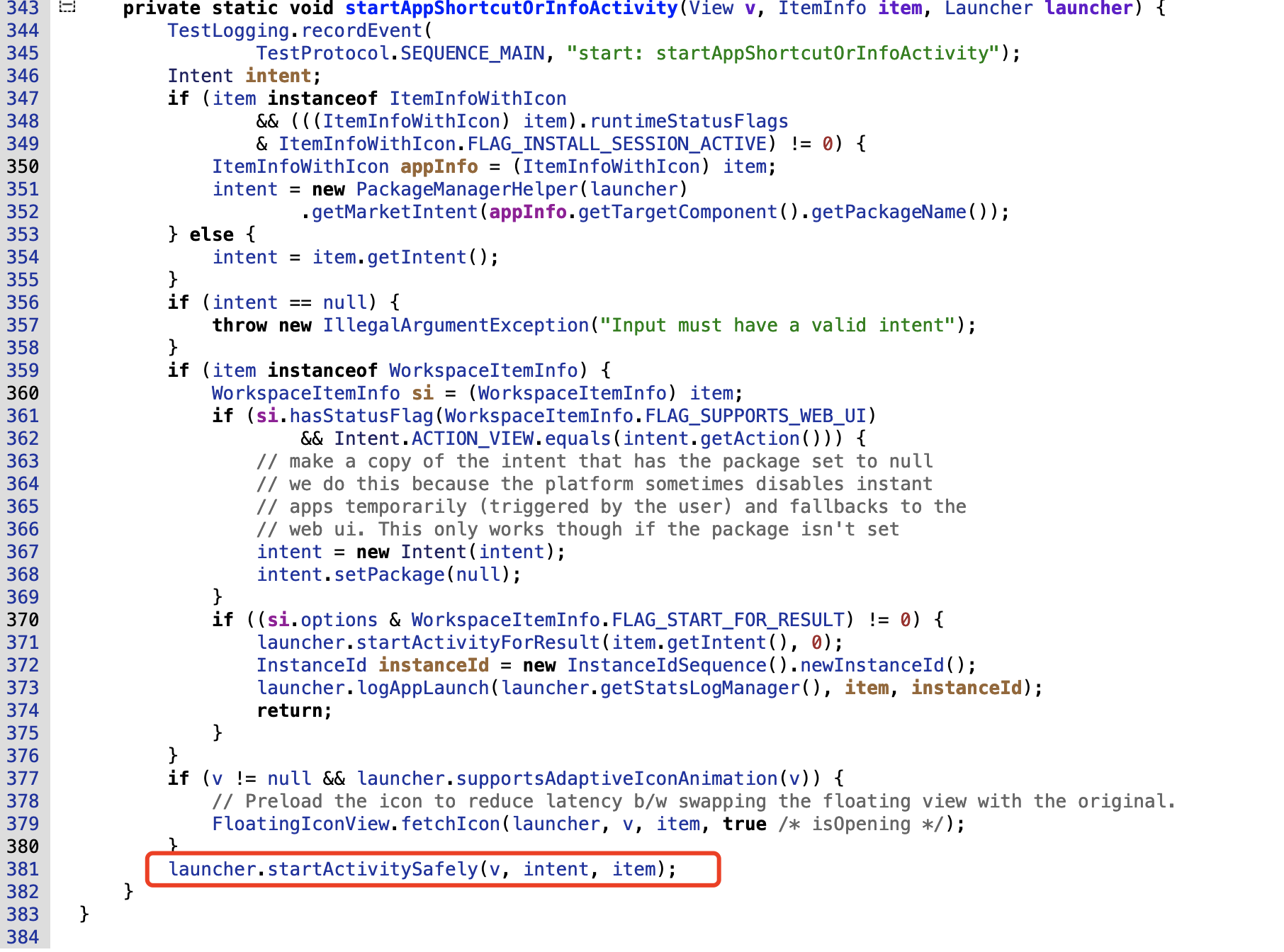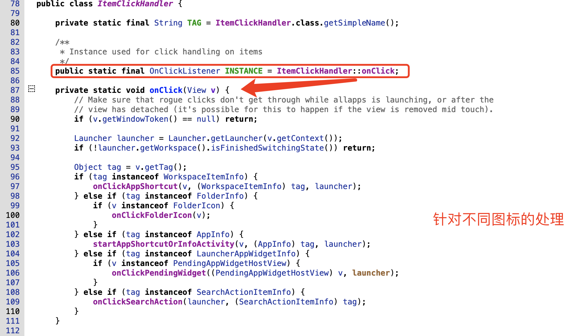 跟进源码:/packages/apps/Launcher3/src/com/android/launcher3/touch/ItemClickHandler.java