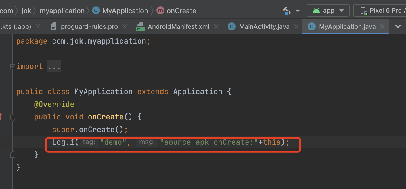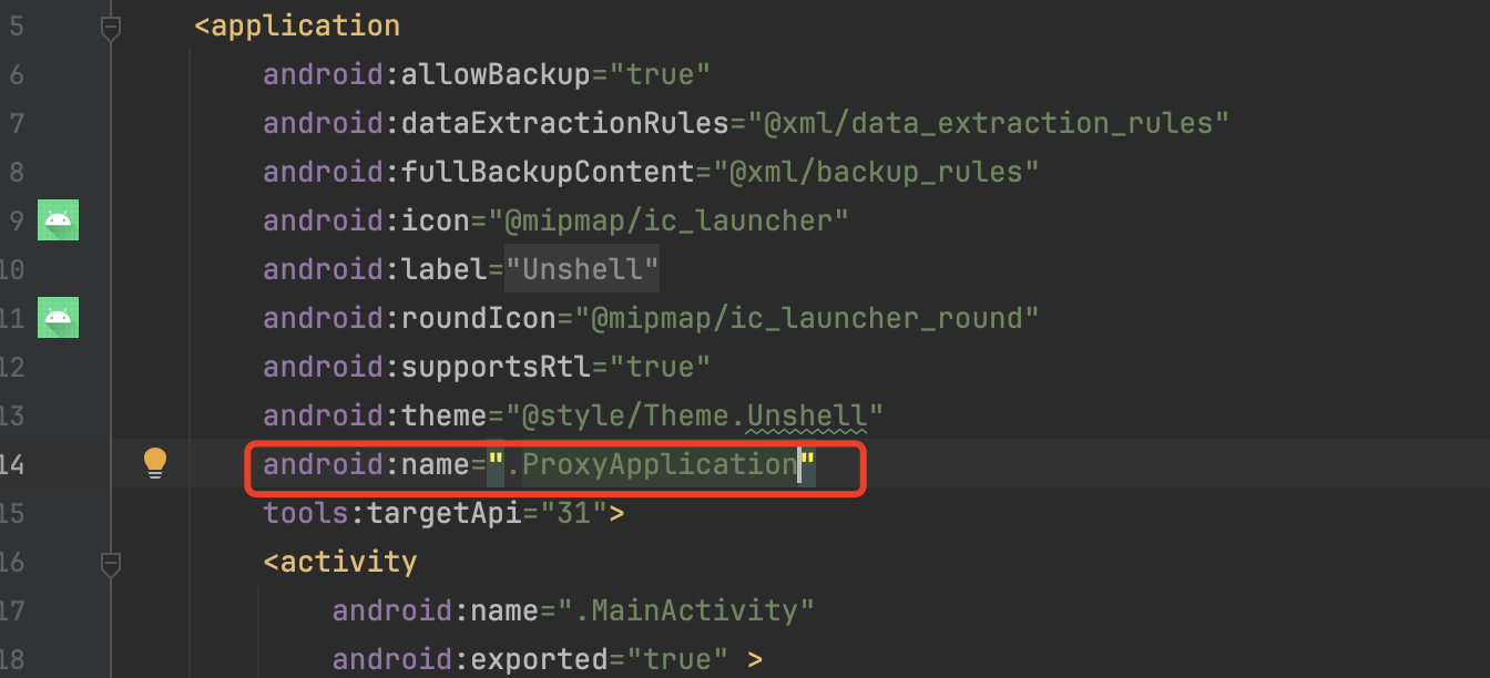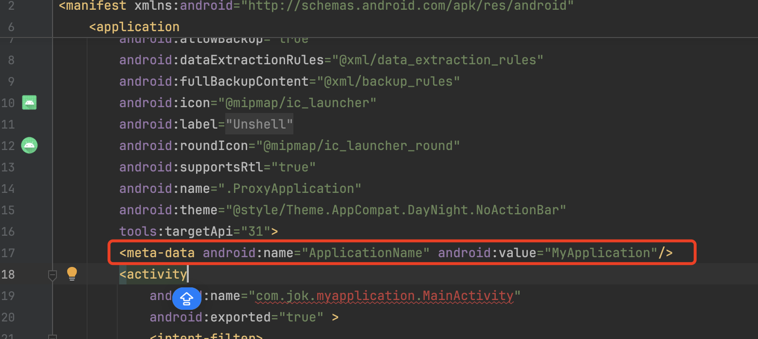 然后要修改AndroidManifest.xml,将Application的实例改为我们自定义的ProxyApplication