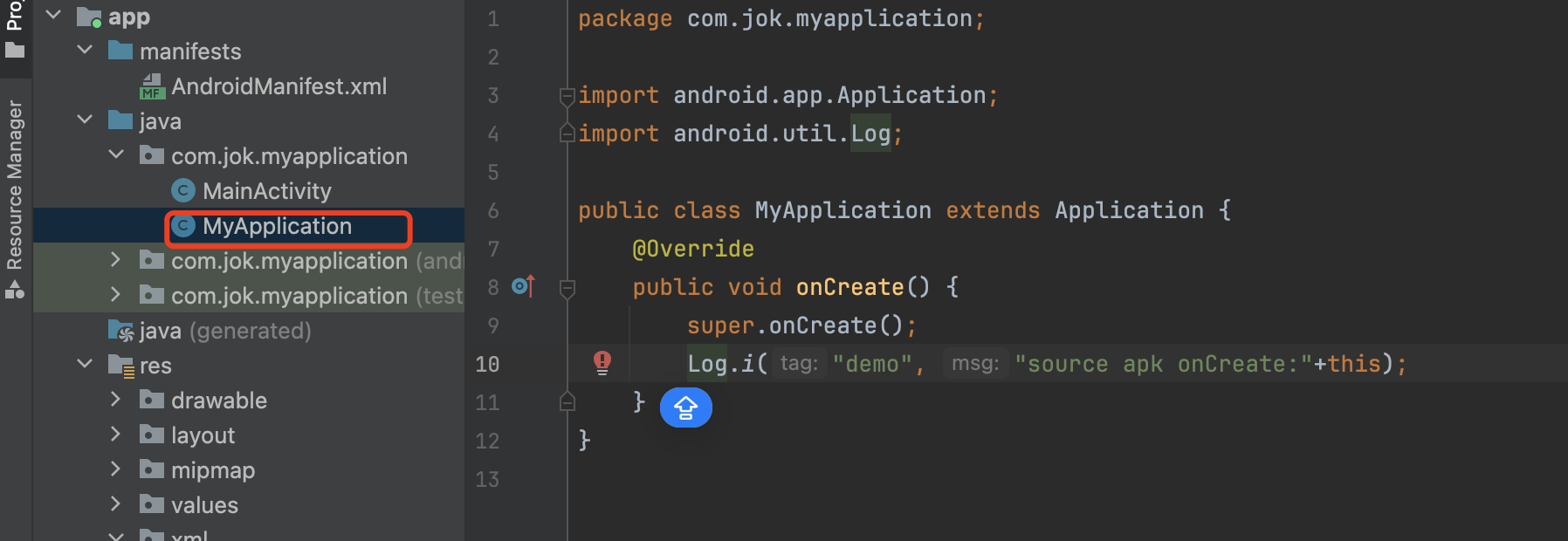 然后添加一个MyAppliaction类,并重写一下OnCreate,输出一下Log。