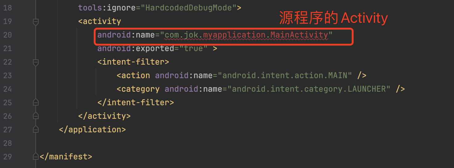 xml里面指定源程序的Activity,那就需要在壳程序的attachBaseContext中添加如下代码运行MainActivity。1