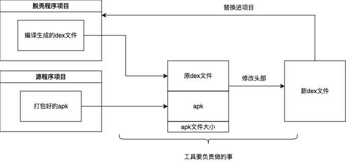 简单点说,就是把源程序给藏起来,然后在外面包一层用于脱壳的程序,这个脱壳的程序会把源程序给释放出来,并通过反射机制,加载源程序。