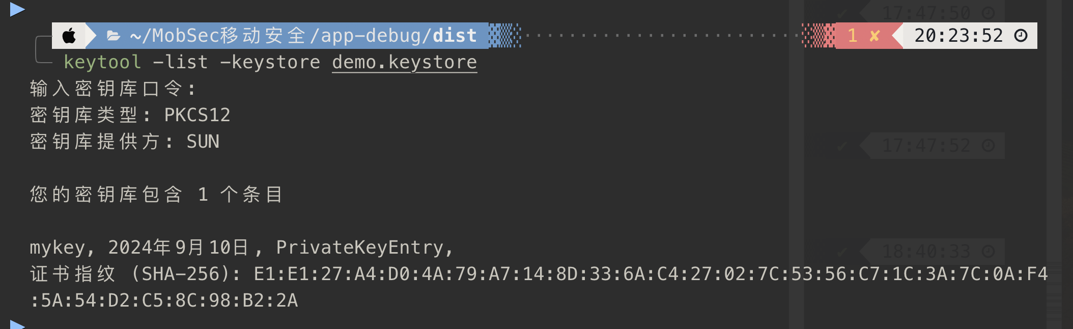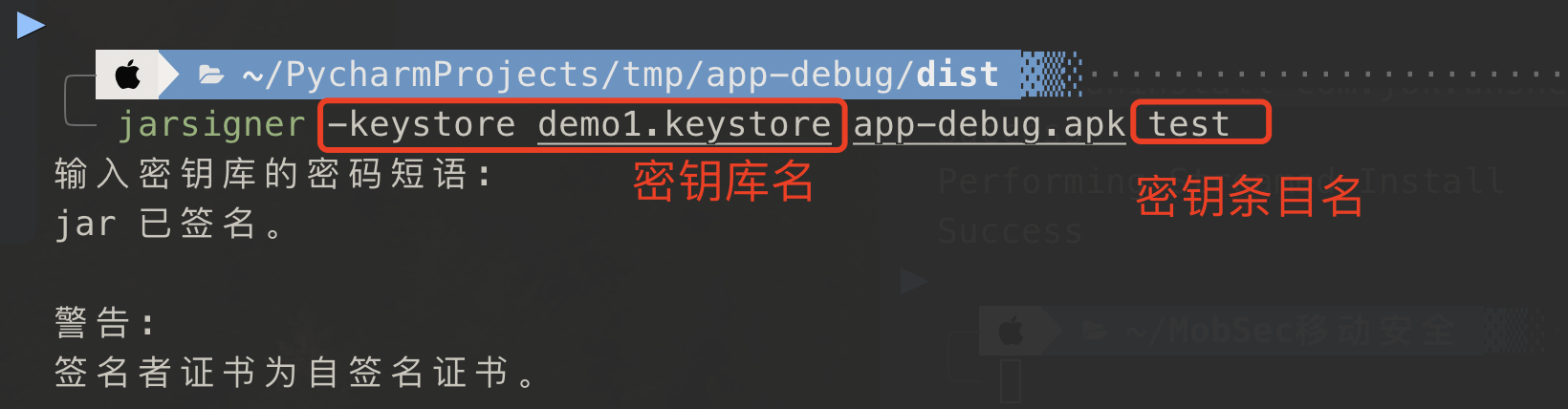 1 | jarsigner -keystore 密钥库名 xxx.apk 密钥别名 |