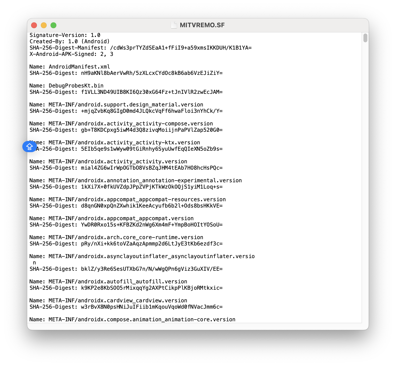 MANIFEST.MF:储存apk中每一个文件的摘要。*.SF:MANIFEST.MF文件的摘要信息以及MANIFEST.MF文件当中每个条目在用摘要算法计算得到的摘要信息。*.RSA:包含*.SF的签名及签名的公钥证书