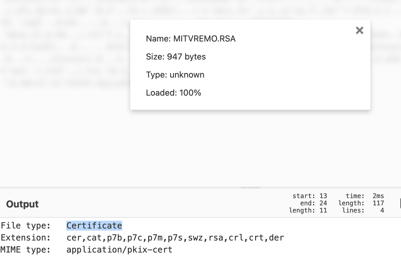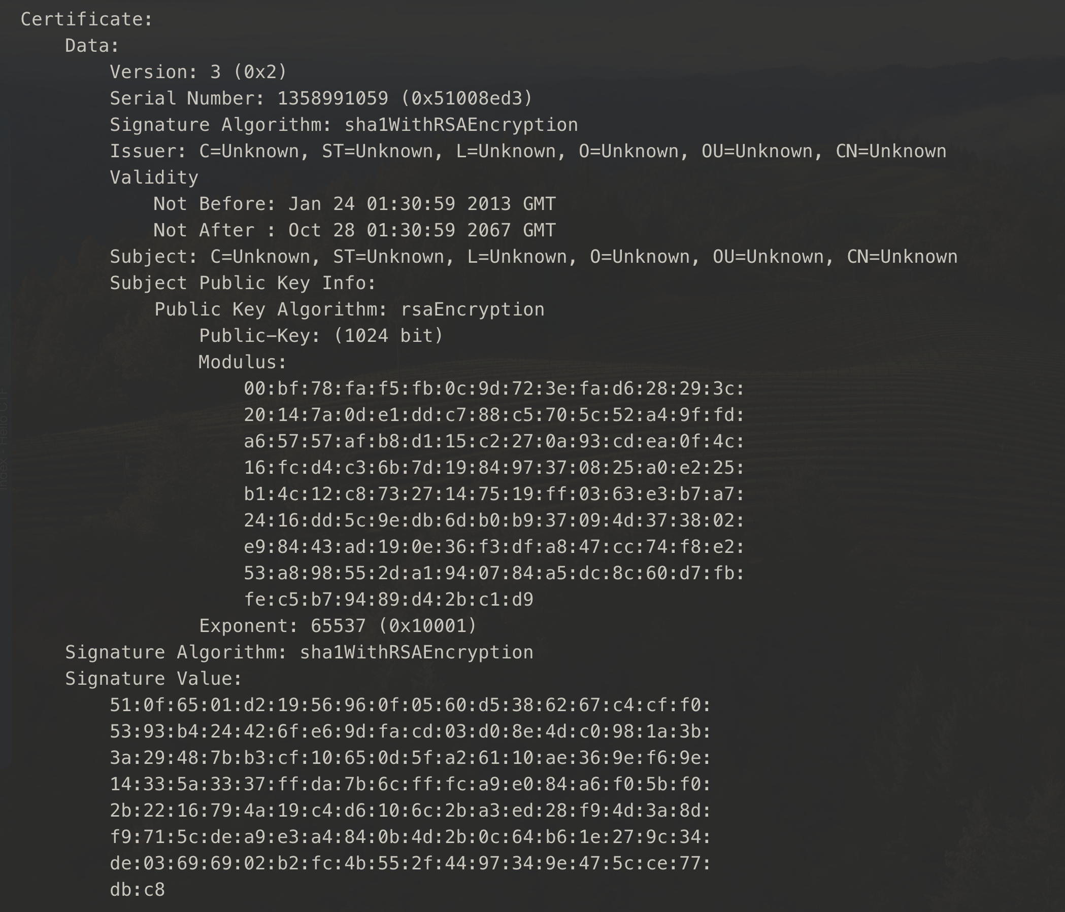 1 | openssl pkcs7 -inform DER -in <*.RSA文件路径> -text -noout -print_certs |
